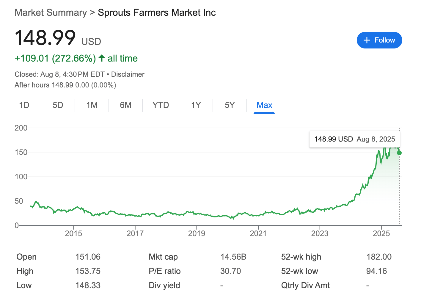 The stock only really started to take off around 2024, as growth really started to take off. This growth continued in the Q2 2025 numbers, which were just reported. Total quarterly revenue was up 17% to $2.2B YoY, same-store sales were up 10%, gross margin improved 91 bps, net income was up 45%, and 12 new stores were opened. Out of all those numbers, what stands out to Wall Street the most is the net income/sales. At 6%, that is 1-6x compared to most retailers in the grocery space. Impressive, but will definitely be hard to sustain. Part of this can be attributed to expanding its Private Label assortment, but the other part is attributed to raising prices to consumers and raising fees to its suppliers. As long as Sprouts keeps growing, suppliers will be willing to continue investing. However, as soon as that growth stops, I would imagine most suppliers will pull back, as Sprouts is super expensive. Same on the consumer front, as long as consumers feel their dollar is maximized at Sprouts, they will continue to shop there. Luckily, there is a huge opportunity to keep growing. Whole Foods has 500+ stores, Trader Joe’s has 600+. Finally, it will be interesting to see how much this growth was due to the UNFI, a key natural foods distributor, having an outage. Sprouts does not use UNFI, but many of their competitors, like Whole Foods, do.