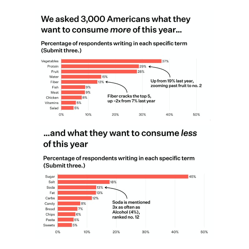 When I laid out my predictions for 2026, the first prediction I shared was around consumption, specifically that hydration and fiber were going to be big for 2026. According to the customer data from this, Water (#4) and Fiber (#5) are aspects customers are going to want to consume more of this year, with fiber growing pretty fast compared to last year. It makes sense, too. These are areas in which customers are deficient and want to improve their health. With all the focus on health, it was only a matter of time before these areas received focus.